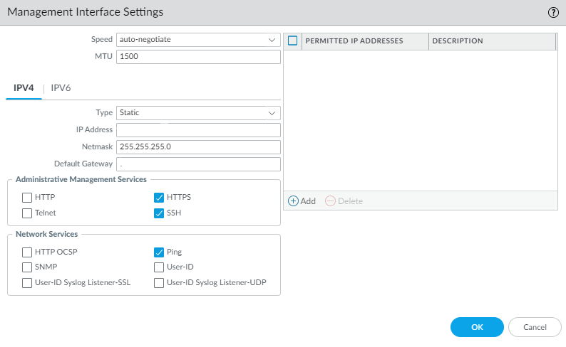 Click OK to save your settings.Configure the MGT interface.- Select DeviceSetupInterfaces and edit the Management interface.Set the Speed to auto-negotiate.Specify the MTU in bytes for packets sent on this interface.Select IPv4 or IPv6.To configure IPv4 address settings for the MGT interface, select an address Type:
