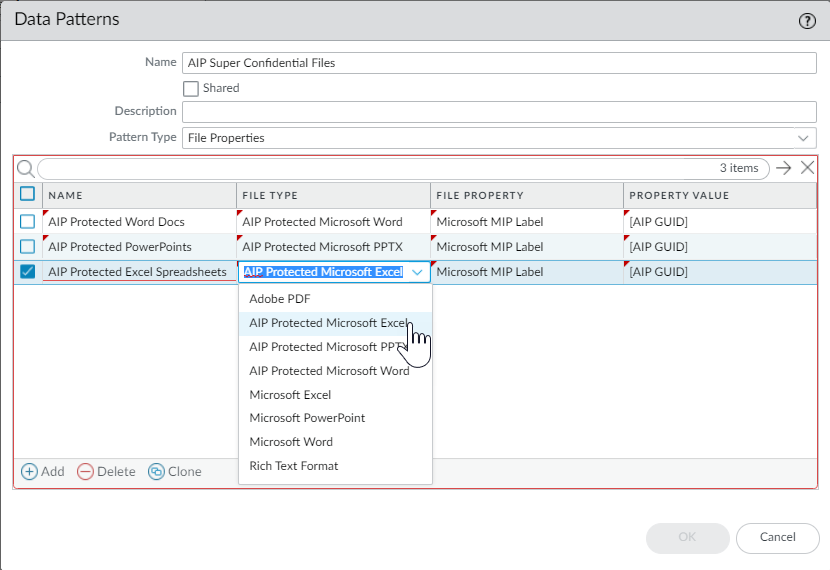 - For Azure Information Protection labeled documents: Select any File Type except Rich Text Format. For the file type you choose, set the File Property to Microsoft MIP Label, and enter the Azure Information Protect label GUID as the Property Value.