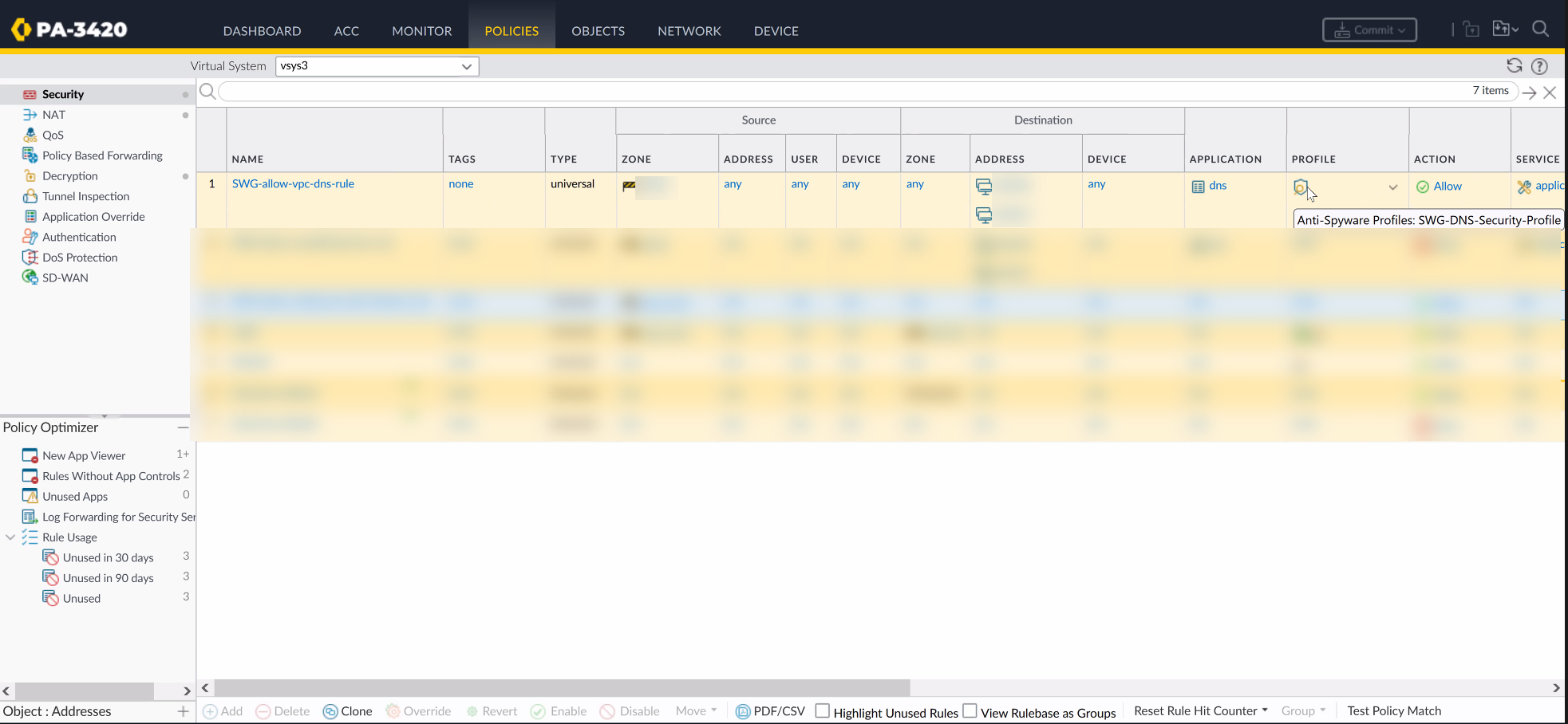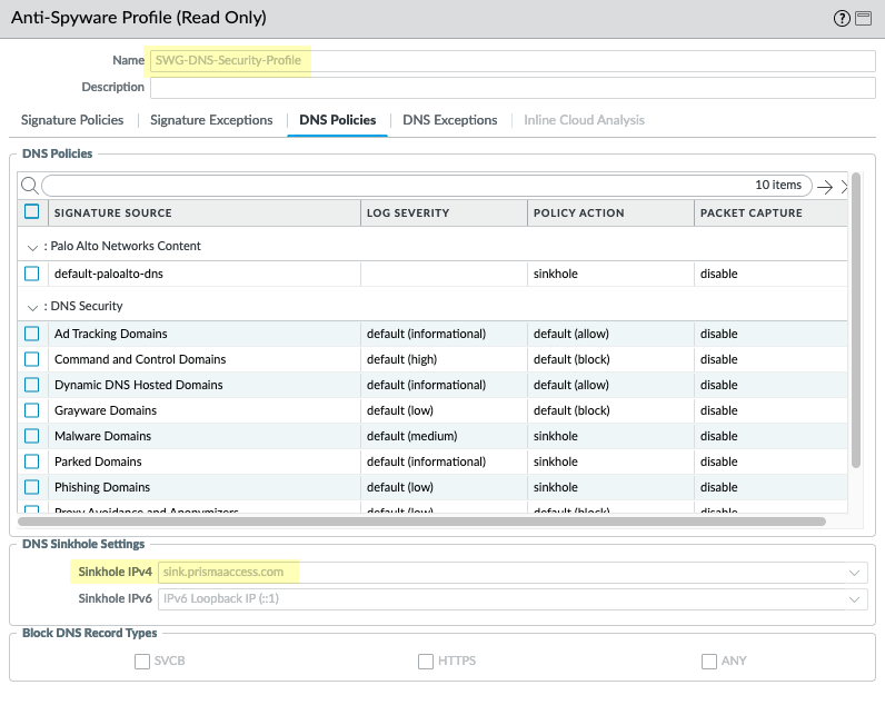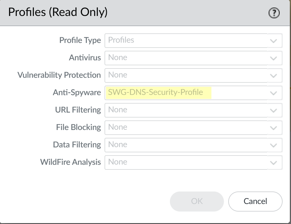 - SWG-block-unsolicited-dns-rule —Blocks unauthorized traffic to the primary and secondary DNS server addresses for the web proxy.