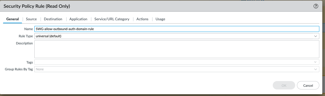 - SWG-allow-outbound-auth-domain-rule — (Explicit proxy with SAML authentication only) Allows traffic from the zone where the web proxy upstream interface is located to the Cloud Services plugin.![]() The autogenerated rule SWG-allow-outbound-auth-domain-rule applies the hybrid-swg-authdomain-bypass URL category to the applicable traffic. The autogenerated rule SWG-allow-outbound-auth-domain-rule applies the hybrid-swg-authdomain-bypass URL category to the applicable traffic.![]() The URL category,hybrid-swg-authdomain-bypass contains the necessary predefined entries for the required domains. The URL category,hybrid-swg-authdomain-bypass contains the necessary predefined entries for the required domains.![]()