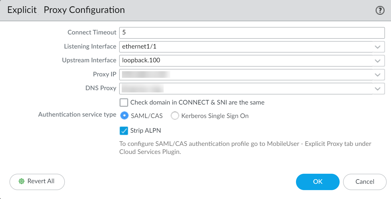 - If you have not already done so, configure Explicit Proxy for mobile users.This is a typical authentication method for on-premises web proxy authentication and Prisma Access Explicit Proxy, which requires a license. Prisma Access Explicit Proxy settings for cookie and timeout values apply to an explicit web proxy configuration as well. You must commit the changes and push them to the relevant firewalls before continuing.If you have not already done so, configure a SAML Authentication profile.(Required for XAU only) If the downstream proxy sends the XAU header, configure a trusted source address for the downstream proxy.- Select DeviceUser IdentificationTrusted Source Address.Edit the settings for the trusted source address to change the status to Enabled.![]() Add any address objects you want to allow X-Authenticated User (XAU).Explicit web proxy requires an IP address object for the trusted source address.Click OK.In the Explicit Proxy Configuration (NetworkProxyExplicit Proxy Configuration), select SAML/CAS as the Authentication service type. Add any address objects you want to allow X-Authenticated User (XAU).Explicit web proxy requires an IP address object for the trusted source address.Click OK.In the Explicit Proxy Configuration (NetworkProxyExplicit Proxy Configuration), select SAML/CAS as the Authentication service type.![]() (Optional but recommended) If you are using a decryption policy for the traffic, select Strip ALPN to remove the value in the Application-Layer Protocol Negotiation (ALPN).This option requires HTTPS.Complete the remaining steps to configure the Configure a Web Proxy. (Optional but recommended) If you are using a decryption policy for the traffic, select Strip ALPN to remove the value in the Application-Layer Protocol Negotiation (ALPN).This option requires HTTPS.Complete the remaining steps to configure the Configure a Web Proxy.Configure Cloud Identity Engine AuthenticationTo simplify configuration for SAML-based authentication for the explicit web proxy, the firewall or Panorama automatically generates the following rules to allow the necessary traffic. If you are using Panorama, you must select an individual firewall to view the rules.![]()  - SWG-allow-vpc-dns-rule — Allows traffic from the zone where the web proxy upstream interface is located to the primary and secondary DNS server addresses for the web proxy.![]() The firewall also generates an anti-spyware profile, SWG-DNS-Security-Profile, to allow the required traffic. The firewall also generates an anti-spyware profile, SWG-DNS-Security-Profile, to allow the required traffic.![]() The autogenerated rule SWG-allow-vpc-dns-rule applies this profile to the applicable traffic. The autogenerated rule SWG-allow-vpc-dns-rule applies this profile to the applicable traffic.![]()
