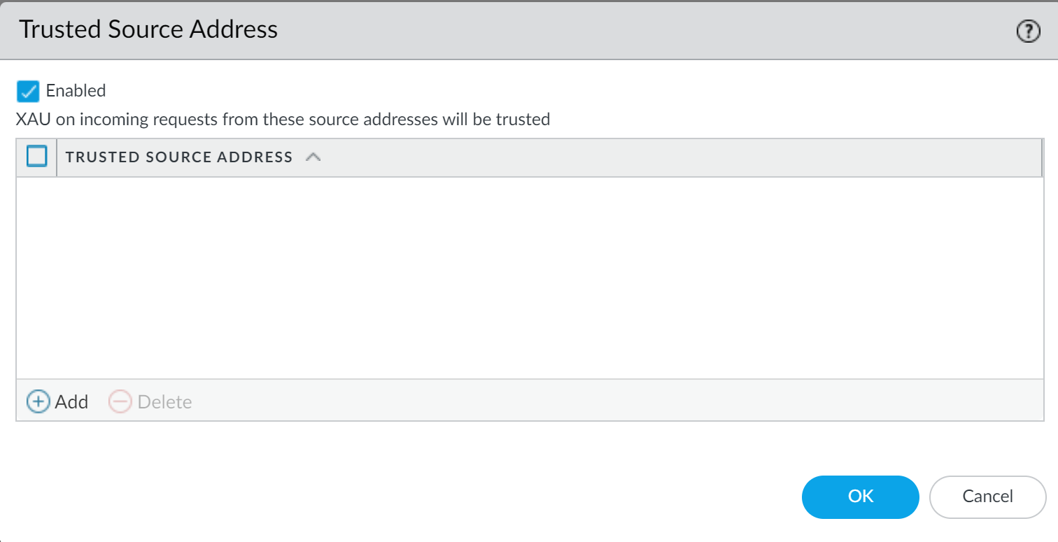 - If you have not already done so, configure Explicit Proxy for mobile users.You must commit the changes and push them to the relevant firewalls before continuing.If you have not already done so, configure authentication using the Cloud Identity Engine and configure a Cloud Identity Engine authentication profile.(Required for XAU only) If the downstream proxy sends the XAU header, configure a trusted source address for the downstream proxy.- Select DeviceUser IdentificationTrusted Source Address.Edit the settings for the trusted source address to change the status to Enabled.![]() Add any address objects you want to allow X-Authenticated User (XAU).Explicit web proxy requires an IP address object for the trusted source address.Click OK.In the Explicit Proxy Configuration (NetworkProxyExplicit Proxy Configuration), select SAML/CAS as the Authentication service type. Add any address objects you want to allow X-Authenticated User (XAU).Explicit web proxy requires an IP address object for the trusted source address.Click OK.In the Explicit Proxy Configuration (NetworkProxyExplicit Proxy Configuration), select SAML/CAS as the Authentication service type.![]() (Optional but recommended) Select Strip ALPN to remove the value in the Application-Layer Protocol Negotiation (ALPN).This option requires HTTPS.Complete the remaining steps to configure the Configure a Web Proxy. (Optional but recommended) Select Strip ALPN to remove the value in the Application-Layer Protocol Negotiation (ALPN).This option requires HTTPS.Complete the remaining steps to configure the Configure a Web Proxy.