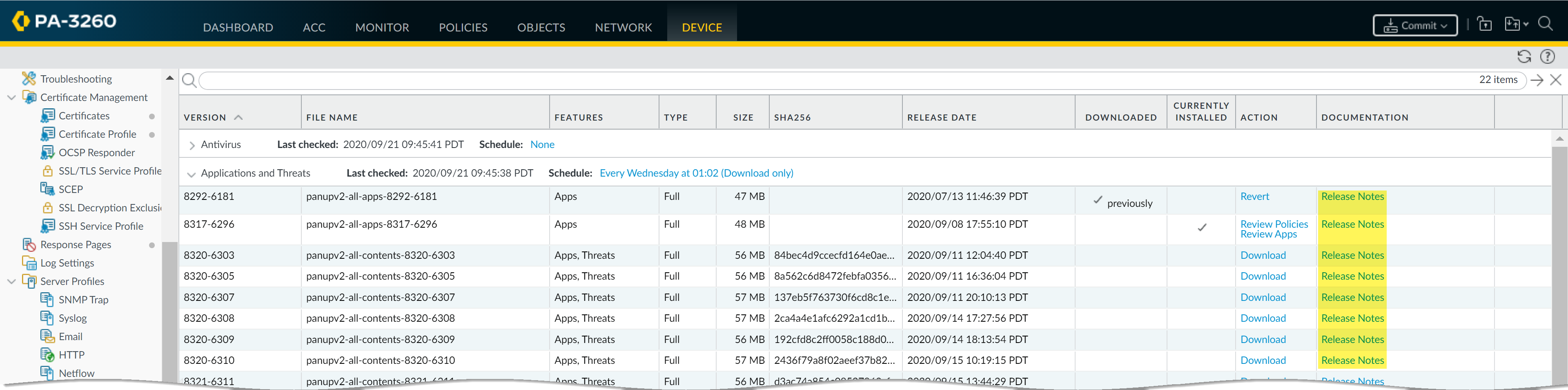 You can also review Content Release Notes for apps and threats on the Palo Alto Networks Support Portal or directly in the firewall web interface: select DeviceDynamic Updates and open the Release Note for a specific content release version.