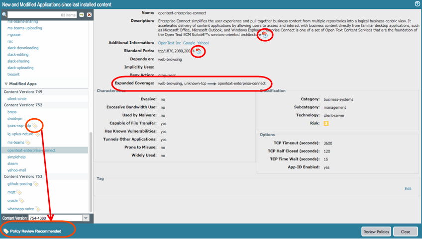 For both downloaded and installed content updates, you can see a list of the new and modified App-IDs the update includes. Full application details are provided, and importantly, updates to applications with network-wide impact (for example, LDAP or IKE) are prominently flagged as a recommended for policy review. For modified App-IDs, application details also describe how coverage is either now expanded or more precise.