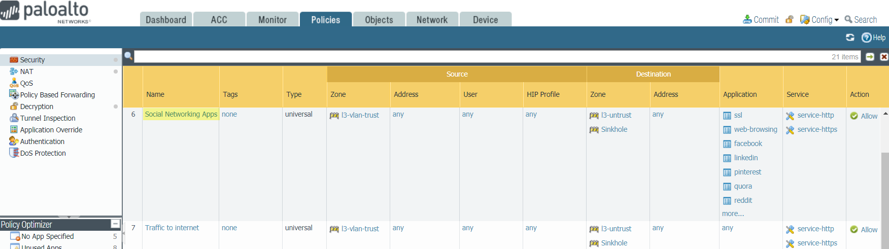 8. In PoliciesSecurity, the cloned rule (Social Networking Apps) is inserted in the rulebase above the original port-based rule (Traffic to internet).