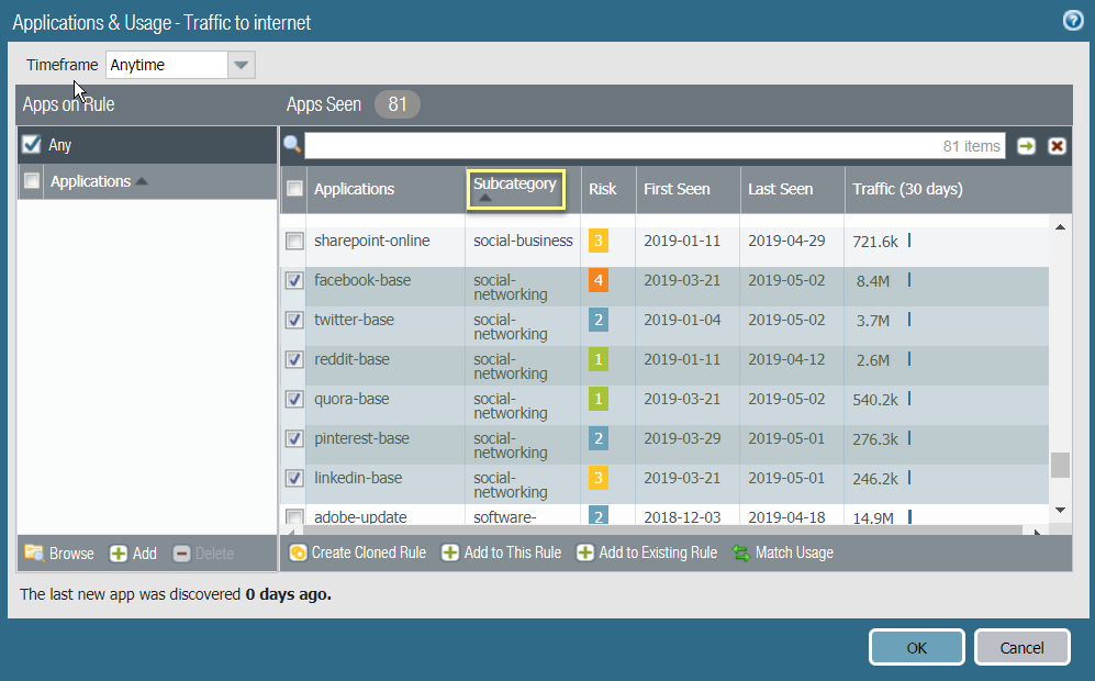 For example, click Subcategory to sort the applications, scroll to the social-networking subcategory, and then select the applications you want to allow.