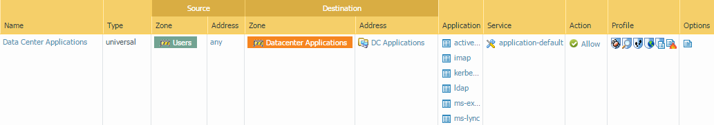 Enable access to data center applications.- Select PoliciesSecurity and Add a rule.In the General tab, Enter a descriptive Name for the rule.In the Source tab, set the Source Zone to Users.In the Destination tab, set the Destination Zone to Data Center Applications.In the Applications tab, Add the applications that correspond to the network services you want to safely enable. For example, select activesync, imap, kerberos, ldap, ms-exchange, and ms-lync.In the Service/URL Category tab, keep the Service set to application-default.In the Actions tab, set the Action Setting to Allow.Set Profile Type to Profiles and select the following security profiles to attach to the policy rule: