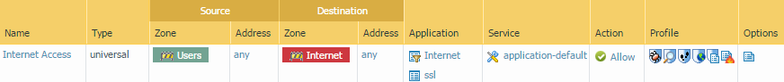 Enable access to general internet applications.This is a temporary rule that allows you to gather information about the traffic on your network. After you have more insight into which applications your users need to access, you can make informed decisions about which applications to allow and create more granular application-based rules for each user group.- Select PoliciesSecurity and Add a rule.In the General tab, enter a descriptive Name for the rule.In the Source tab, set the Source Zone to Users.In the Destination tab, set the Destination Zone to Internet.In the Applications tab, Add an Application Filter and enter a Name. To safely enable access to legitimate web-based applications, set the Category in the application filter to general-internet and then click OK. To enable access to encrypted sites, Add the ssl application.In the Service/URL Category tab, keep the Service set to application-default.In the Actions tab, set the Action Setting to Allow.Set Profile Type to Profiles and select the following security profiles to attach to the policy rule: