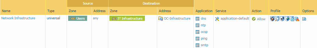 - Select PoliciesSecurity and click Add.In the General tab, enter a descriptive Name for the rule.In the Source tab, set the Source Zone to Users.In the Destination tab, set the Destination Zone to IT Infrastructure.As a best practice, use address objects in the Destination Address field to enable access to specific servers or groups of servers only, particularly for services such as DNS and SMTP that are commonly exploited. By restricting users to specific destination server addresses, you can prevent data exfiltration and command and control traffic from establishing communication through techniques such as DNS tunneling.In the Applications tab, Add the applications that correspond to the network services you want to safely enable. For example, select dns, ntp, ocsp, ping, and smtp.In the Service/URL Category tab, keep the Service set to application-default.In the Actions tab, set the Action Setting to Allow.Set Profile Type to Profiles and select the following security profiles to attach to the policy rule:
