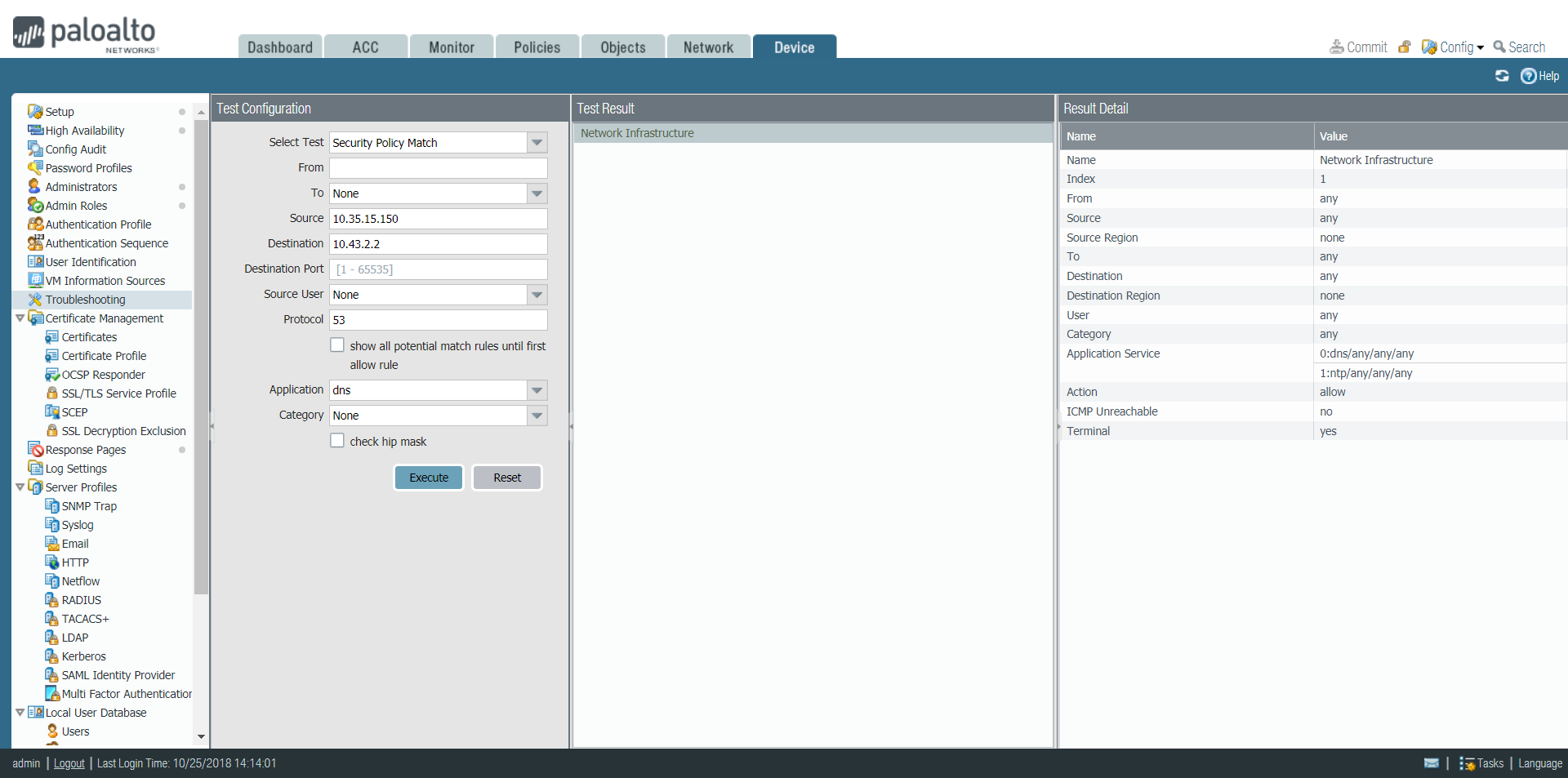 Save your policy rules to the running configuration on the firewall.Click Commit.To verify that you have set up your basic policies effectively, test whether your Security policy rules are being evaluated and determine which Security policy rule applies to a traffic flow.For example, to verify the policy rule that will be applied for a client in the user zone with the IP address 10.35.14.150 when it sends a DNS query to the DNS server in the data center:- Select DeviceTroubleshooting and select Security Policy Match (Select Test).Enter the Source and Destination IP addresses.Enter the Protocol..Select dns (Application)Execute the Security policy match test.