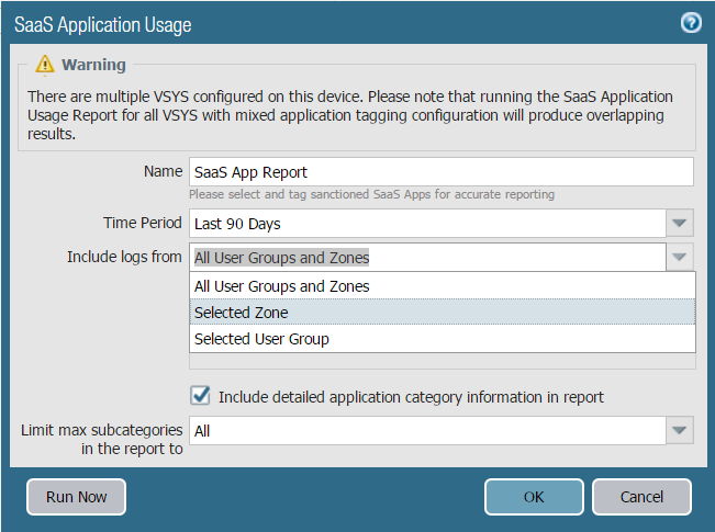 Select whether you want to include all the application subcategories in the report (the default) or Limit the max subcategories in the report to the top 10, 15, 20 or 25 categories (default is all subcategories).Click Run Now to generate the report on-demand for the last 7-day and the last 30-day time period. Make sure that the pop-up blocker is disabled on your browser because the report opens in a new tab.Click OK to save your changes.Schedule Reports for Email Delivery.The last 90-days report must be scheduled for email delivery.On the PA-220R and the PA-800 Series firewalls, the SaaS Application Usage report is not sent as a PDF attachment in the email. Instead, the email includes a link that you must click to open the report in a web browser.