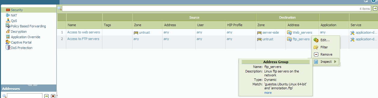 - Select PoliciesSecurity, and select the rule.Select the drop-down arrow next to the address group link, and select Inspect. You can also verify that the match criteria is accurate.