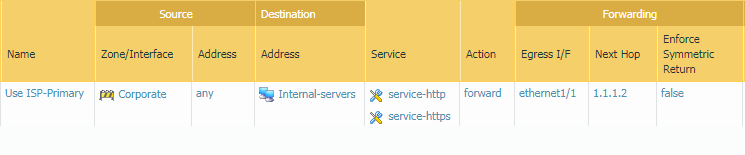 Specify where to forward traffic.- In the Forwarding tab, specify the interface to which you want to forward traffic and enable path monitoring.To forward traffic, set the Action to Forward, and select the Egress Interface and specify the Next Hop. In this example, the egress interface is ethernet1/1, and the next hop IP address is 1.1.1.1 (you cannot use a FQDN for the next hop).Enable Monitor and attach the default monitoring profile to trigger a failover to the backup ISP. In this example, we do not specify a target IP address to monitor. The firewall will monitor the next hop IP address; if this IP address is unreachable, the firewall will direct traffic to the default route specified on the virtual router.(Required if you have asymmetric routes) Select Enforce Symmetric Return to ensure that return traffic from the Corporate zone to the internet is forwarded out on the same interface through which traffic ingressed from the internet.NAT ensures that the traffic from the internet is returned to the correct interface/IP address on the firewall.Click OK to save the changes.