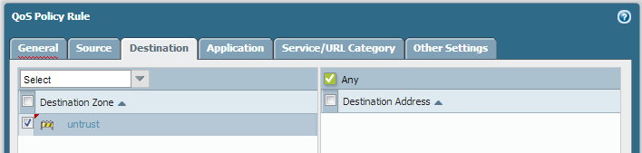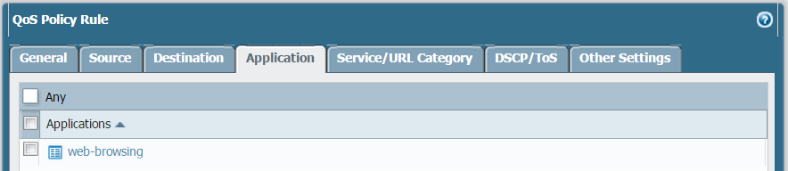 Click OK to save the QoS profile.Create a QoS policy.In an environment with multiple virtual systems, traffic spans more than one virtual system. Because of this, when you are enabling QoS for a virtual system, you must define traffic to receive QoS treatment based on source and destination zones. This ensures that the traffic is prioritized and shaped only for that virtual system (and not for other virtual systems through which the traffic might flow).- Select PoliciesQoS and Add a QoS Policy Rule.Select General and give the QoS Policy Rule a descriptive Name.Specify the traffic to which the QoS policy rule will apply. Use the Source, Destination, Application, and Service/URL Category tabs to define matching parameters for identifying traffic.For example, select Application and Add web-browsing to apply the QoS policy rule to that application:
