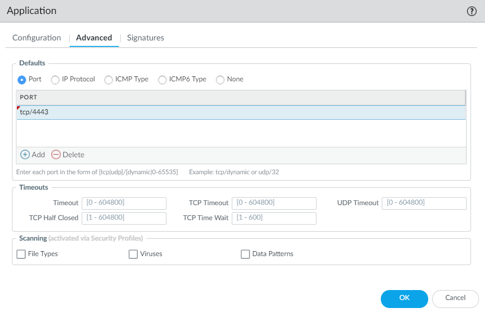 Under Advanced, define settings that will allow the firewall to identify the application protocol:- Specify the default ports or protocol that the application uses. To specify signatures independent of protocol, select None.
