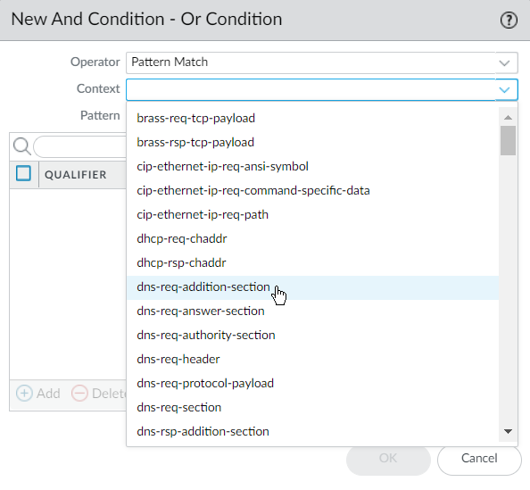 - If you select Pattern Match, select a Context and then use a regular expression to specify the Pattern. Optionally, Add a qualifier/value pair.
