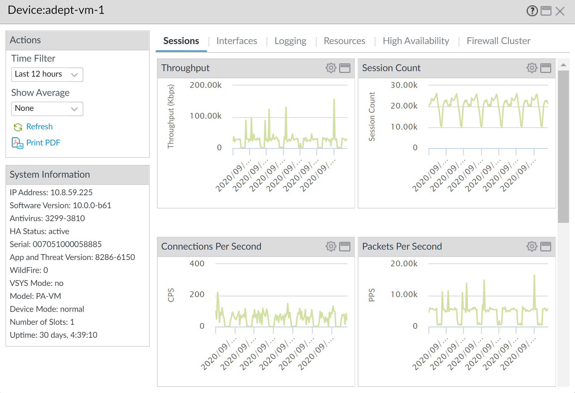 monitor the health of managed firewalls.View All Devices to see a list of all managed firewalls and the monitored health metrics. Select an individual firewall to view Detailed Device View with time-trended graphs and tables of monitored metrics.