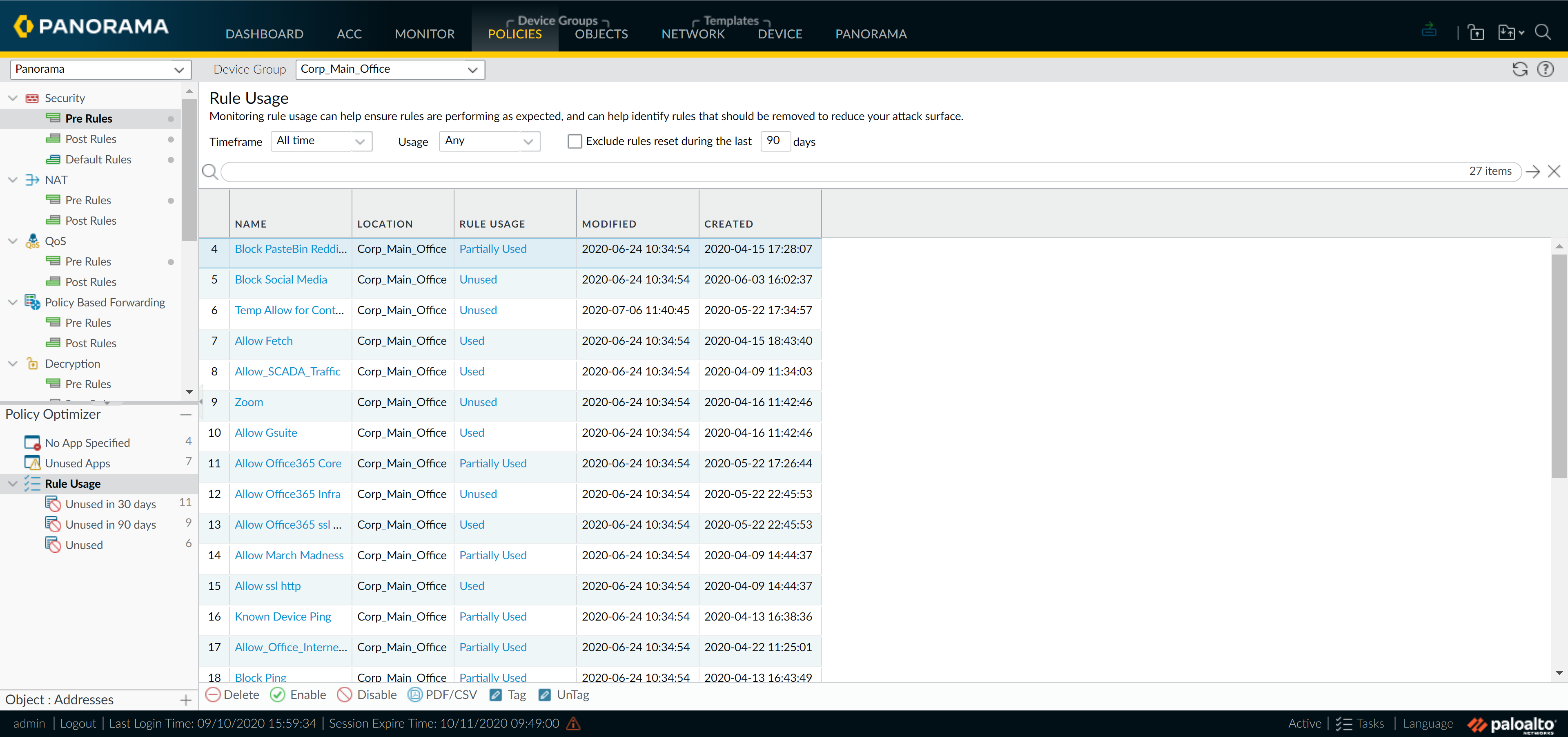 - Created—The date and time the policy rule was created.If the rule was created when Panorama was running PAN-OS 8.1 and the Policy Rule Hit Count setting is enabled, the First Hit date and time is used as the Created date and time on upgrade to PAN-OS 9.0 or later releases. If the rule was created in PAN-OS 8.1 when the Policy Rule Hit Count setting was disabled or if the rule was created when Panorama was running PAN-OS 8.0 or an earlier release, the Created date for the rule will be the date and time you successfully upgraded Panorama to PAN-OS 9.0 or later releases.