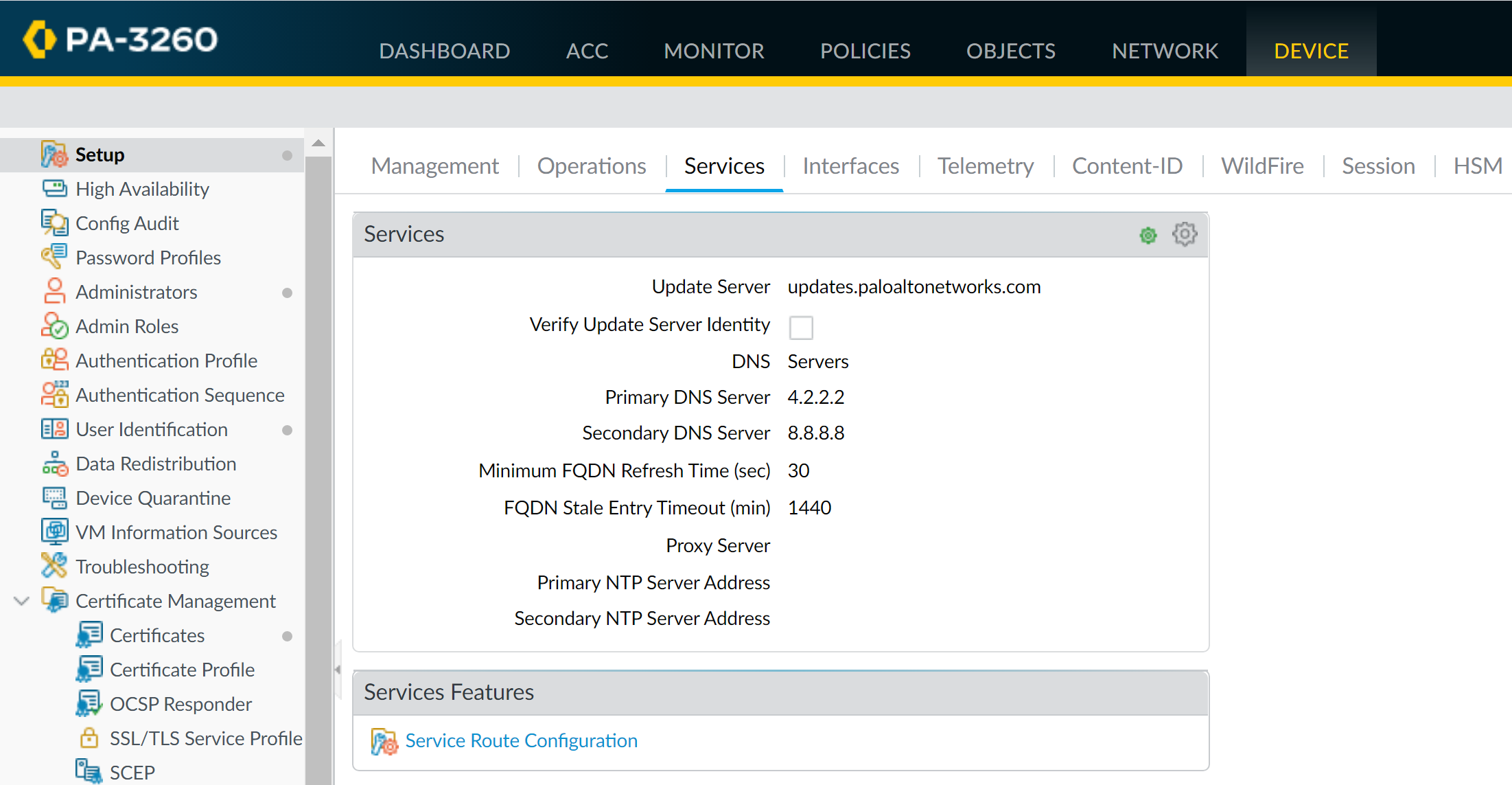 - Select DeviceSetupServicesGlobal, and edit the Services section.