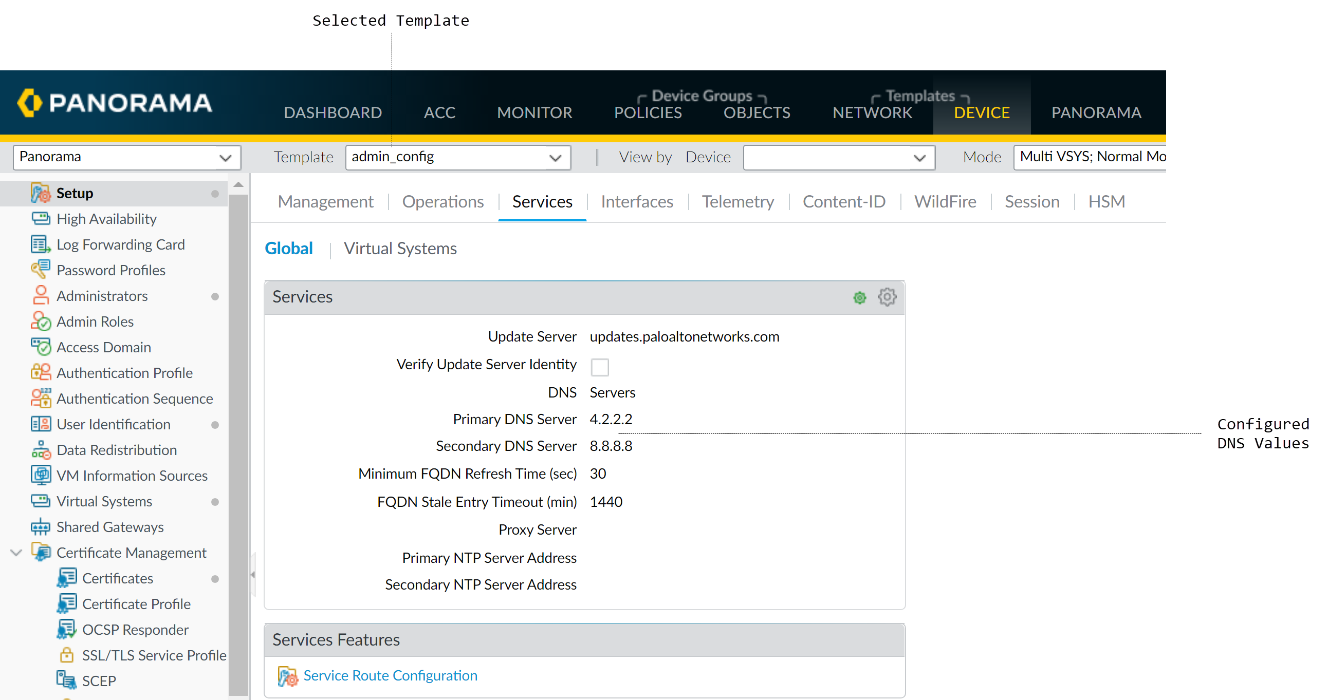 template to push a configuration change to firewalls.Renaming a vsys is allowed only on the local firewall, not on Panorama the result is an entirely new vsys or the new vsys name gets mapped to the wrong vsys on the firewall.For example, define a primary Domain Name System (DNS) server for the firewalls in the template.You can also Configure a Template or Template Stack Variable to push device-specific values to managed devices.- In the Device tab, select the Template from the drop-down.