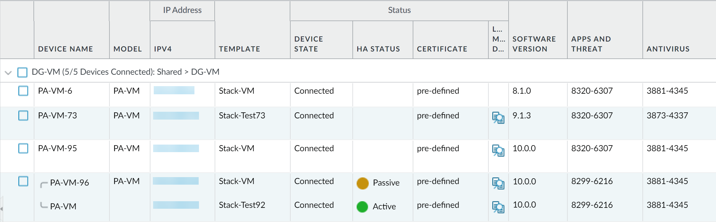- After the firewalls finish rebooting, select PanoramaManaged Devices and verify the Software Version is 10.0.0 for the firewalls you upgraded. Also verify that the HA status of any passive firewalls you upgraded is still passive.