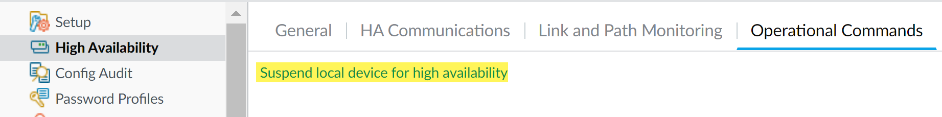 - Select DeviceHigh AvailabilityOperational CommandsSuspend local device.