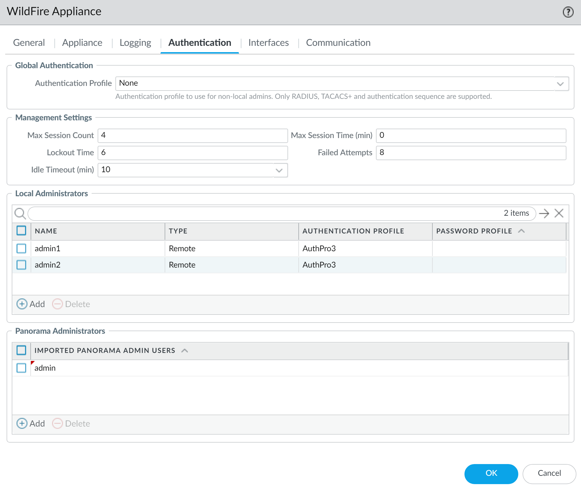 - Add the WildFire appliance administrators.Administrators may either be added as a local administrator or as an imported Panorama administrator—but not both. Adding the same administrator as both a local administrator and as an imported Panorama administrator is not supported and causes the Panorama commit to fail. For example, the commit to Panorama fails if you add admin1 as both a local and Panorama administrator.
