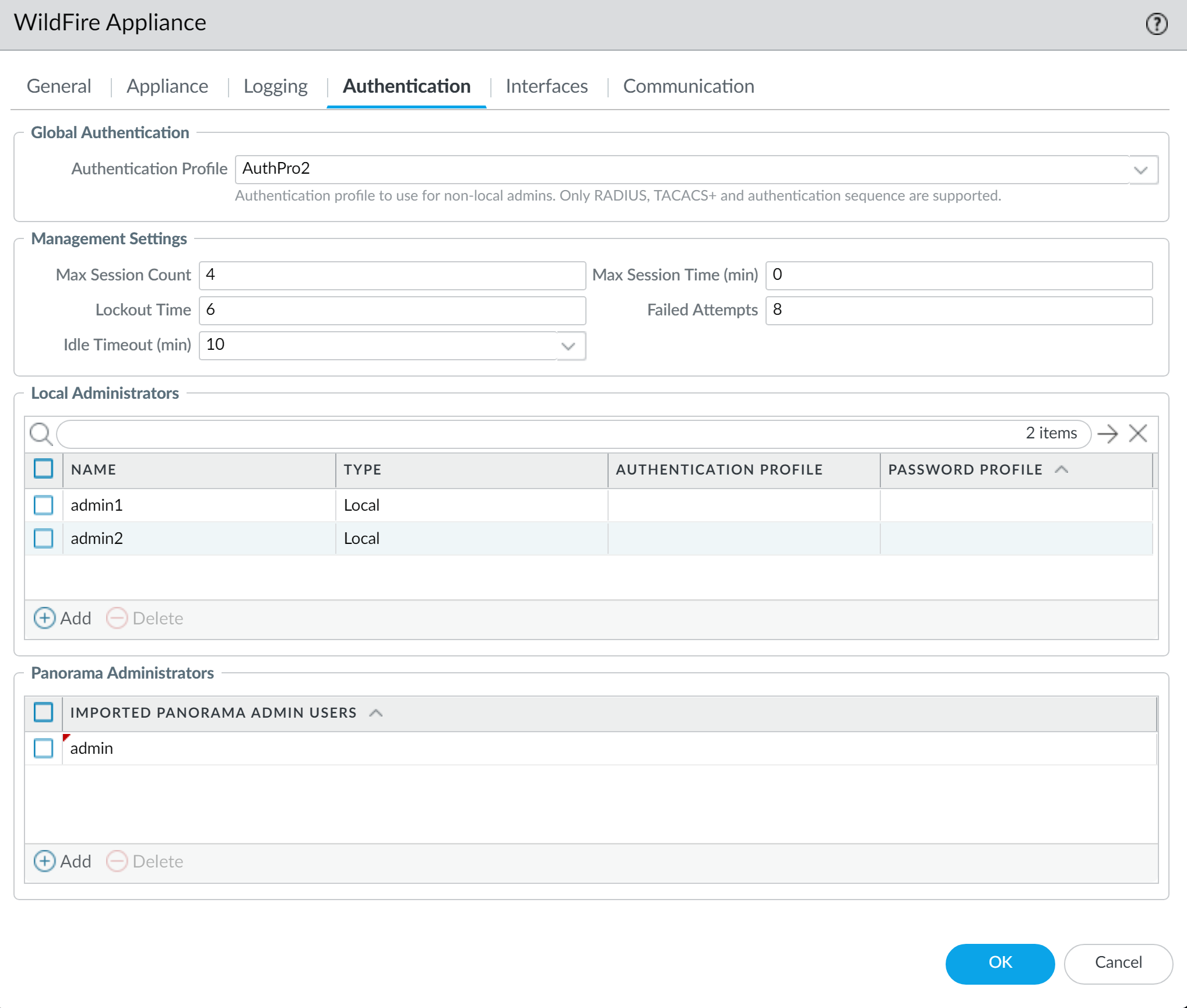 - Add any administrators configured on Panorama. These administrators are created on Panorama and imported to the WildFire appliance.