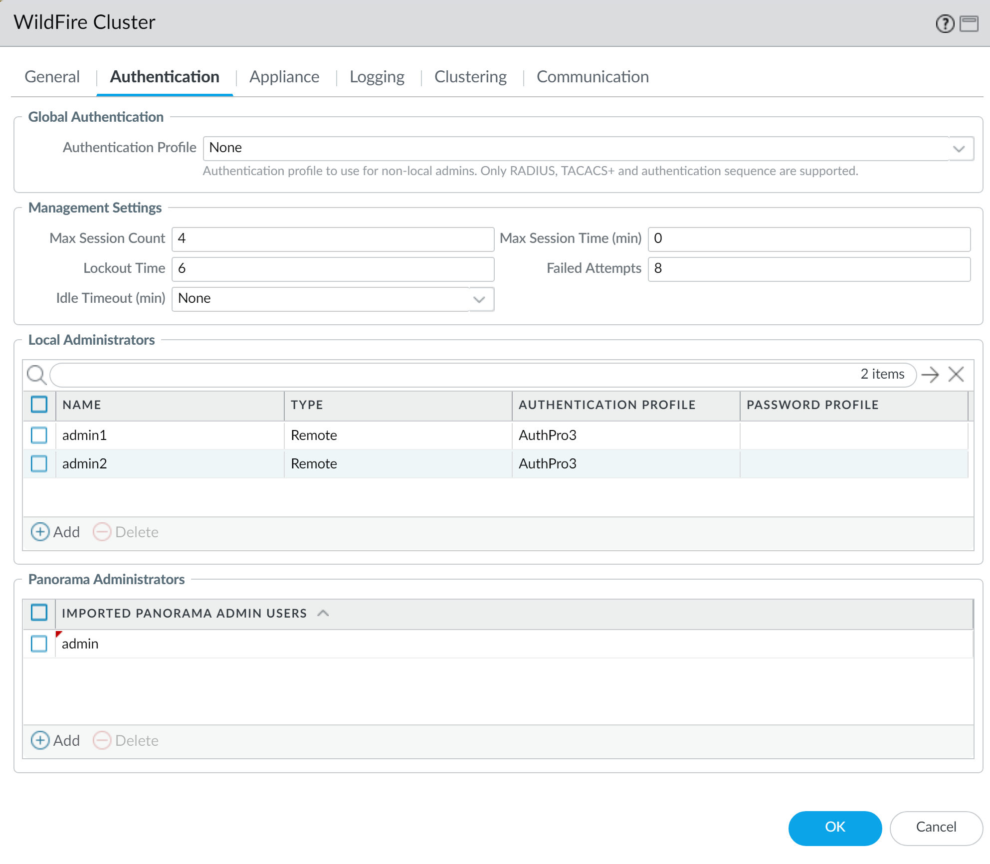 - Import existing Panorama administratorsImport existing administrators configured on Panorama. These administrators are configured and managed on Panorama and imported to all WildFire appliances in the WildFire cluster.