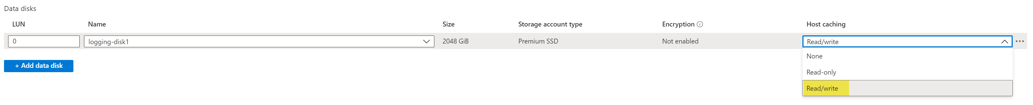 - For the Host caching, select Read/write.