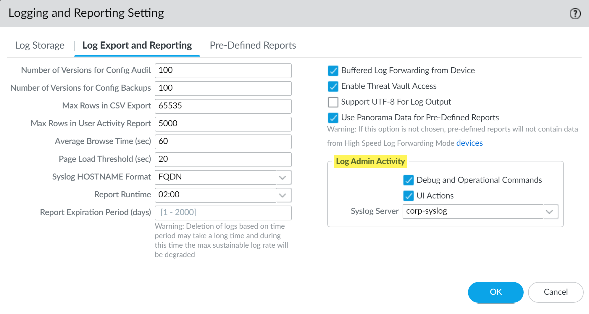 - Select PanoramaSetupManagement and edit the Logging and Reporting Settings.Select Log Export and Reporting.In the Log Admin Activity section, configure what administrator activity to track.