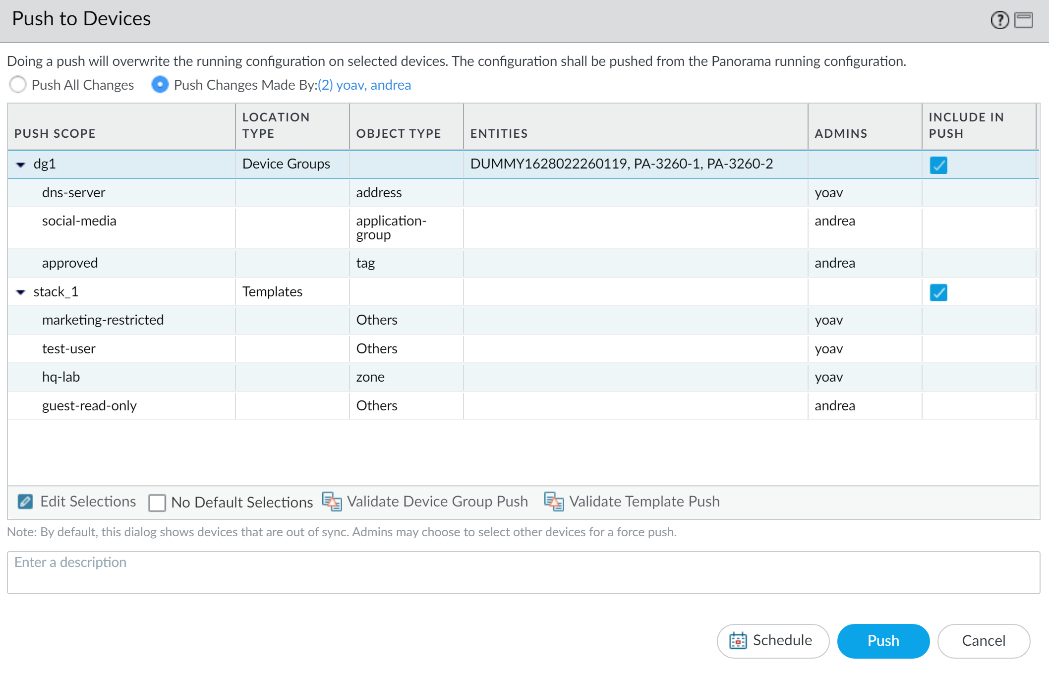 - Log in to the Panorama Web Interface.The Panorama administrator must be configured with an admin role profile that allows the push of configuration changes made by other admins to managed firewalls. The default Superuser or Panorama admin role privileges support full object level configuration privileges.Select Commit and Push to Devices.You can also select Commit and Push to commit selective configuration changes to Panorama and push already committed changes in one operation.You cannot selectively push a configuration change that has not been committed.Change the push scope to Push Changes Made By and filter the push scope by Panorama admin to select specific device group and template stack configuration changes to push to your managed firewalls.The push scope displays the name of the admin currently logged in. Click the admin name to view a list of admins with committed configuration changes that have not been pushed to managed firewalls. The push scope automatically refreshes to display an updated list of device groups and template stacks based on the admins selected.In the Include in Push column, check (enable) the configuration objects you want to include in the commit.The push scope displays only device groups and template stacks that are out of sync.You must select and push the entire device group or template stack configuration that was committed. Object level changes displayed in the push scope are informational and cannot be excluded from the push for the device group or template stack you select.(Optional) Edit Selections and select the managed firewalls associated with the impacted device groups and template stacks.Skip this step to push to all managed firewalls associated with the impacted device groups and template stacks.Disable the Merge with Device Candidate Config setting if you manage and commit local firewall configuration changes independently of the Panorama managed configuration.This setting is enabled by default and merges any pending local firewall configurations with the configuration push from Panorama. The local firewall configuration is merged and committed regardless of the admin pushing the changes from Panorama or the admin who made the local firewall configuration changes.Push the configuration changes.If your admin role allows you to push configuration changes for other Panorama administrators, review the Confirm Push to Devices prompt and Push.This warning is displayed when the administrators included in the Admin Scope make conflicting configuration changes to the same object. For example, Admin1 is allowed to push configuration changes to managed firewalls while Admin2 is not allowed. Admin1 creates SecurityRule, adds ZoneA as the source zone and commits the change. Admin2 then modifies SecurityRule, deletes ZoneA, adds ZoneB, and as well as making additional configuration changes. Admin2 commits the changes to Panorama. Admin1 wants to include the configuration changes made by Admin1 in the push to managed firewalls. In this scenario, Admin1 is prompted to confirm the push because the configuration changes made to SecurityRule conflict.If you are not confident in the configuration changes made by other Panorama administrators, Continue push with my selected changes only to only push your own configuration changes and overwrite any configuration object conflict with the changes you made.