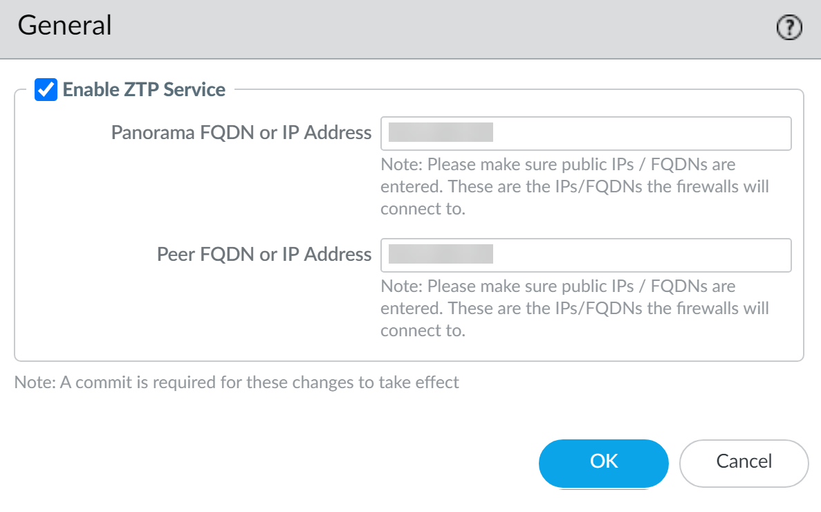 - Enable ZTP Service.Enter the Panorama FQDN or IP Address.This is the FQDN or public IP address of the Panorama the ZTP plugin is installed on and that the CSP pushes to the ZTP firewalls.(Managed firewalls running PAN-OS 10.1.4 and earlier releases) Enter the Panorama IP address to avoid the managed firewall disconnecting from Panorama on reboot or after a successful PAN-OS upgrade.If you need to use the Panorama FQDN, configure a static destination route to avoid the managed firewall disconnecting from Panorama on reboot or after a successful PAN-OS upgrade.(HA only) Enter the Peer FQDN or IP Address.This is the FQDN or public IP address of the Panorama peer on which the ZTP plugin is installed and that the CSP pushes to the ZTP firewalls in case of failover.(Managed firewalls running PAN-OS 10.1.4 and earlier releases) Enter the Panorama IP address to avoid the managed firewall disconnecting from Panorama on reboot or after a successful PAN-OS upgrade.If you need to use the Panorama FQDN, configure a static destination route to avoid the managed firewall disconnecting from Panorama on reboot or after a successful PAN-OS upgrade.Click OK to save your configuration changes.