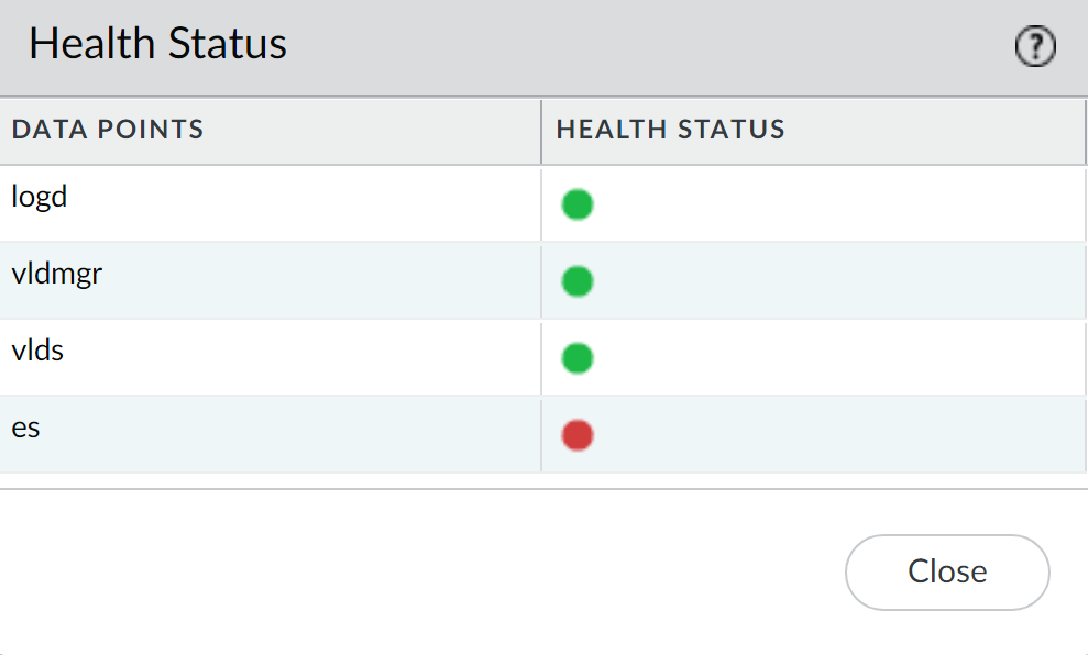 - Log in to the Panorama Web Interface.Configure a Managed Collector.Select PanoramaManaged Collectors and navigate to the Health column.Review the overall health status of the Log Collector.A green circle () indicates that the Log Collector is healthy and red circle (![]() ) indicates that one or more log collection processes are experiencing degraded health. ) indicates that one or more log collection processes are experiencing degraded health.![]() View the Health Status details to view the health status of each log collection process. View the Health Status details to view the health status of each log collection process.- logd— Process responsible for ingesting logs received from the managed firewall and for transferring ingested logs to the vldmgr.
