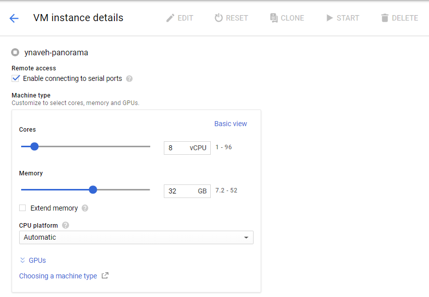 - Edit the Panorama virtual appliance instance details.Under Machine Type, Customize the Panorama virtual appliance CPU cores and memory.