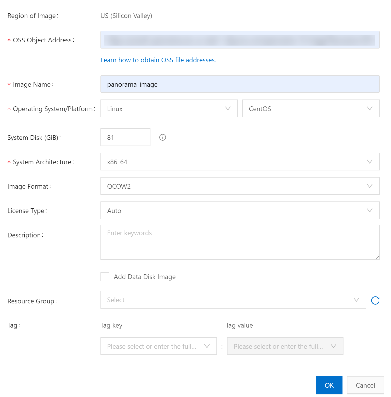 From the Alibaba Cloud menu, select Elastic Compute ServiceInstances & ImagesImages and Import Image.Paste the OSS Object Address for the qcow2 file.This the file URL you copied in the previous step.Enter an Image Name.For the Operating System/Platform, select Linux CentOS.For the System Disk (GiB), enter 81.For the System Architecture, select x86_64.For the Image Format, select QCOW2.Click OK.