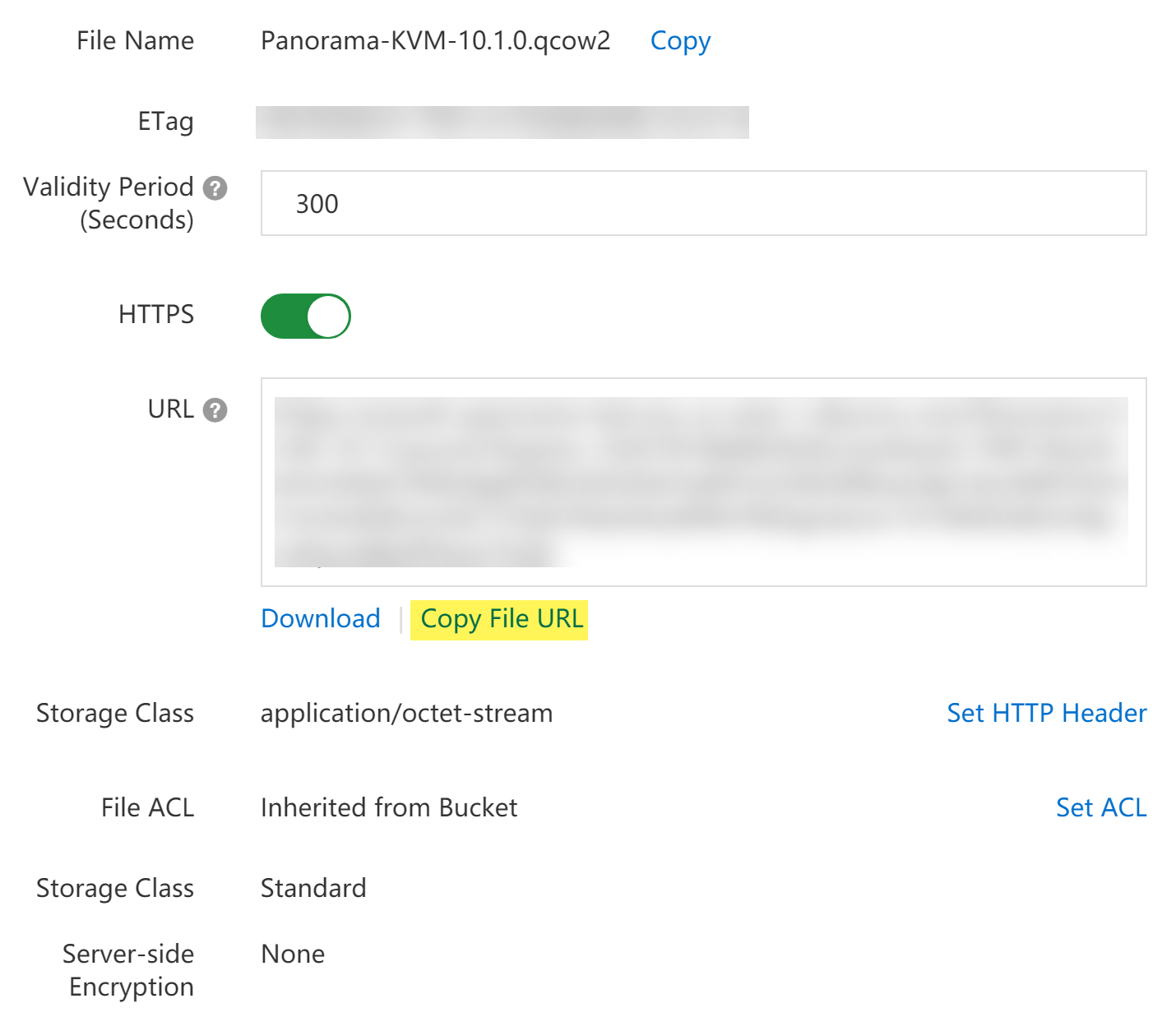 - In the OSS bucket Overview, select Files and click the qcow2 file you uploaded to view the file Details.Click Copy File URL and exit the file Details.