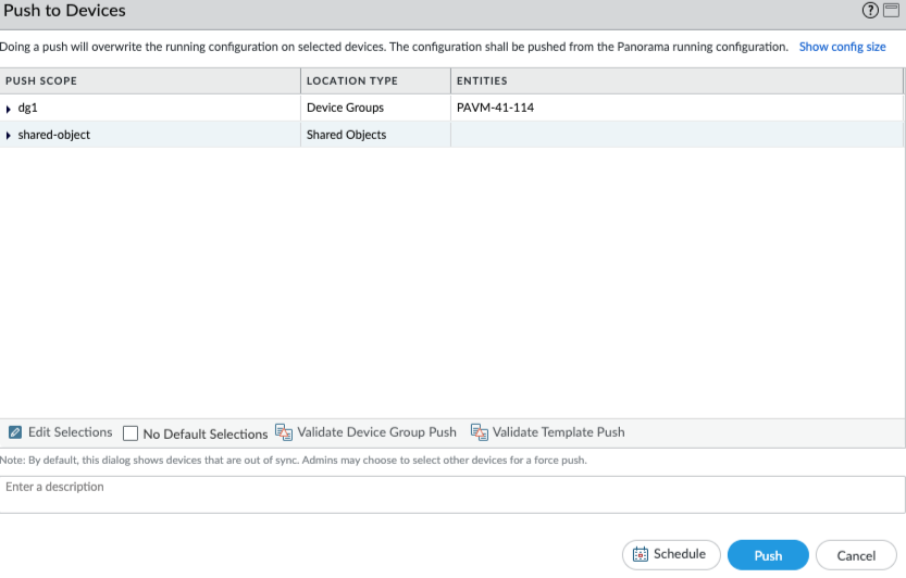 - Log in to the Panorama Web Interface.The Panorama administrator must be configured with an admin role profile that allows the push of configuration changes made by other admins to managed firewalls. The default Superuser or Panorama admin role privileges support full object level configuration privileges.Select Commit and Push to Devices.You can also select Commit and Push to commit selective configuration changes to Panorama and push already committed changes in one operation.You cannot selectively push a configuration change that has not been committed.Change the push scope to Push Changes Made By and filter the push scope by Panorama admin to select specific device group and template stack configuration changes to push to your managed firewalls.The push scope displays the name of the admin currently logged in. Click the admin name to view a list of admins with committed configuration changes that have not been pushed to managed firewalls. The push scope automatically refreshes to display an updated list of device groups and template stacks based on the admins selected.(PAN-OS 11.1.13 and later 11.1 releases) When you disable selective push, the options associated with selective push, such as the Push Changes Made By or Push All Changes options do not appear. By default, the system automatically performs a full push (Push All Changes). For more information, see Enable or Disable Selective Push.In the Include in Push column, check (enable) the configuration objects you want to include in the commit.The push scope displays only device groups and template stacks that are out of sync.You must select and push the entire device group or template stack configuration that was committed. Object level changes displayed in the push scope are informational and cannot be excluded from the push for the device group or template stack you select.(Optional) Edit Selections and select the managed firewalls associated with the impacted device groups and template stacks.Skip this step to push to all managed firewalls associated with the impacted device groups and template stacks.Disable the Merge with Device Candidate Config setting if you manage and commit local firewall configuration changes independently of the Panorama managed configuration.This setting is enabled by default and merges any pending local firewall configurations with the configuration push from Panorama. The local firewall configuration is merged and committed regardless of the admin pushing the changes from Panorama or the admin who made the local firewall configuration changes.Push the configuration changes.If your admin role allows you to push configuration changes for other Panorama administrators, review the Confirm Push to Devices prompt and Push.This warning is displayed when the administrators included in the Admin Scope make conflicting configuration changes to the same object. For example, Admin1 is allowed to push configuration changes to managed firewalls while Admin2 is not allowed. Admin1 creates SecurityRule, adds ZoneA as the source zone and commits the change. Admin2 then modifies SecurityRule, deletes ZoneA, adds ZoneB, and as well as making additional configuration changes. Admin2 commits the changes to Panorama. Admin1 wants to include the configuration changes made by Admin1 in the push to managed firewalls. In this scenario, Admin1 is prompted to confirm the push because the configuration changes made to SecurityRule conflict.If you are not confident in the configuration changes made by other Panorama administrators, Continue push with my selected changes only to only push your own configuration changes and overwrite any configuration object conflict with the changes you made.