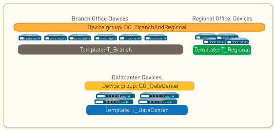 When grouping firewalls for templates, we must take into account the differences in the networking configuration. For example, if the interface configuration is not the same—the interfaces are unlike in type, or the interfaces used are not alike in the numbering scheme and link capacity, or the zone to interface mappings are different—the firewalls must be in separate templates. Further, the way the firewalls are configured to access network resources might be different because the firewalls are spread geographically; for example, the DNS server, syslog servers and gateways that they access might be different. So, to allow for an optimal base configuration, in Use Case: Configure Firewalls Using Panorama we must place the firewalls in separate templates as follows: