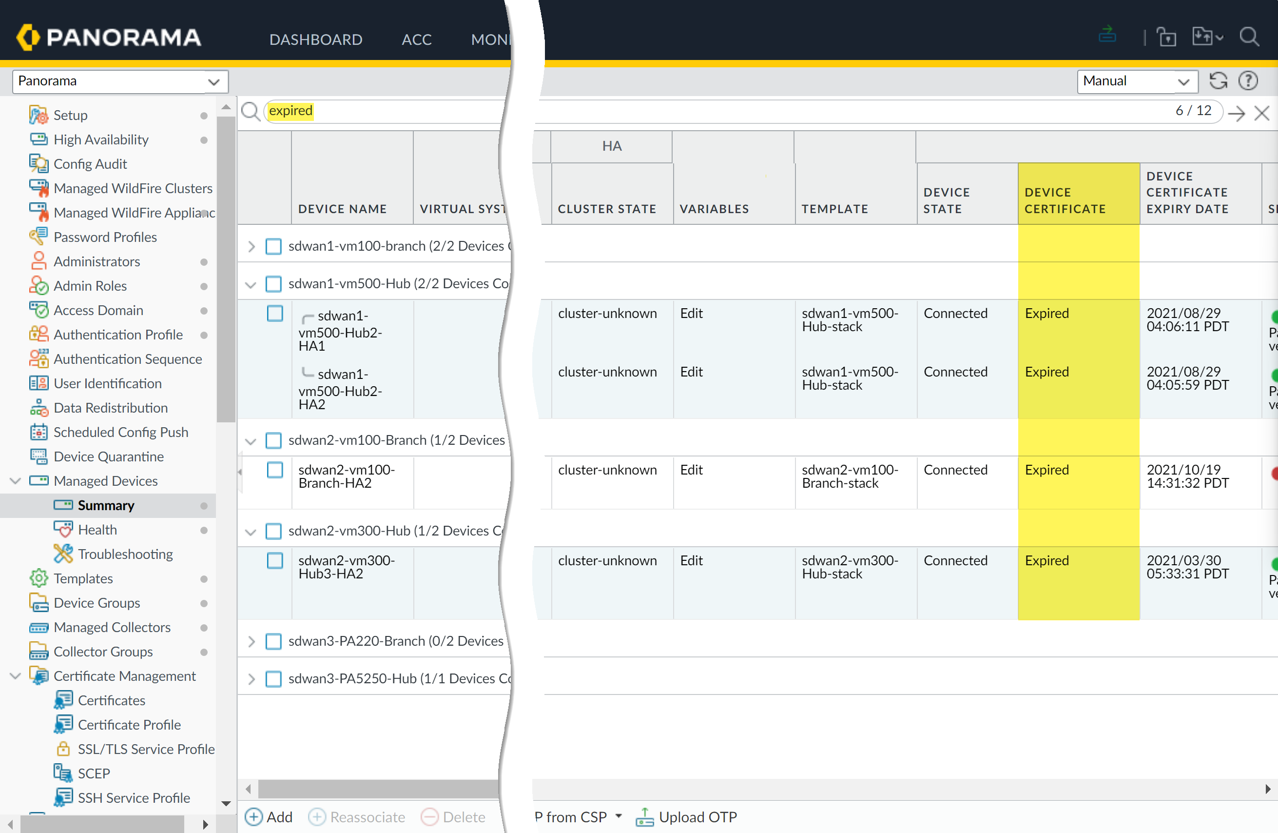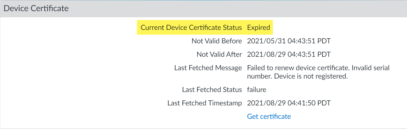 To review the managed firewall device certificate status, select PanoramaManaged FirewallsSummary and filter for expired.The Device Certificate column displays the current Expired device certificate status.