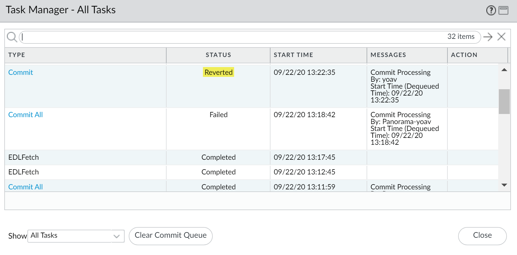 - Verify that the last commit operation (either pushed from Panorama or committed locally) shows a Reverted status.