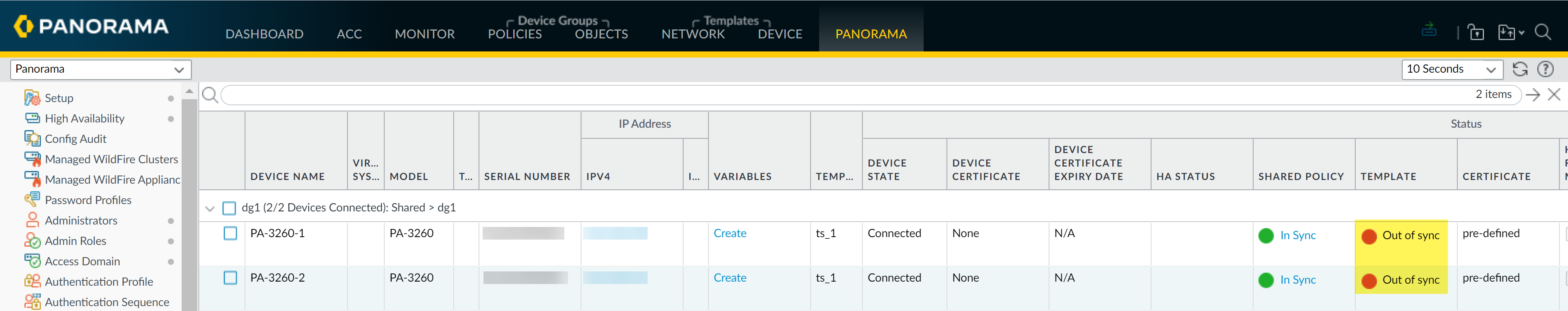 - View the Shared Policy and Template sync status. If you have recently pushed a configuration from Panorama to your managed firewalls and it reverted, the Shared Policy or Template display as Out of Sync (depending on what configuration changes were made).