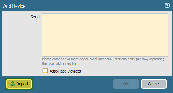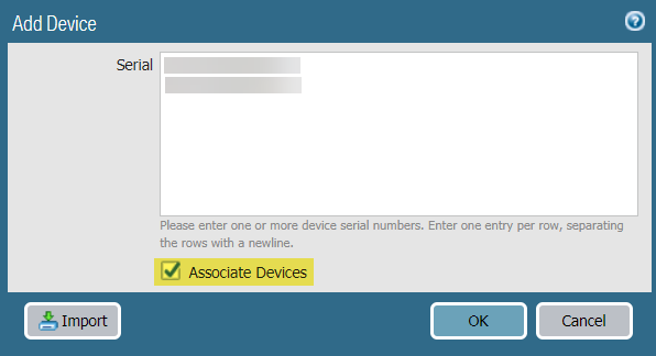 - Enter the firewall Serial number. If you are adding multiple firewalls, enter each serial number on a separate line. If you want to associate the new firewalls with a device group, template stack, collector group, or Log Collector for the initial deployment, continue to the next step. To manually assign each firewall, click OK and continue to Step 3.