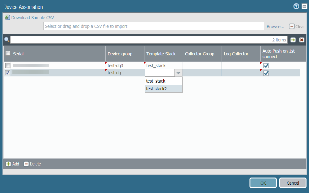 - If not already assigned in the CSV, assign the firewalls a Device Group, Template Stack, Collector Group, and Log Collector as needed from the drop-down foreach column.