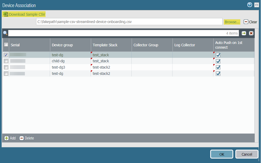 - Download Sample CSV and edit the downloaded CSV file with the firewalls you are adding. You can choose to assign the firewalls to a device group, template stack, Collector Group, and Log Collector from the CSV or enter only the firewall serial numbers and assign them from the web interface. Save the CSV after you finish editing it.