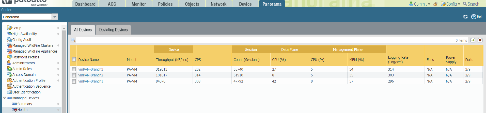 - Select PanoramaManaged DevicesHealth to
