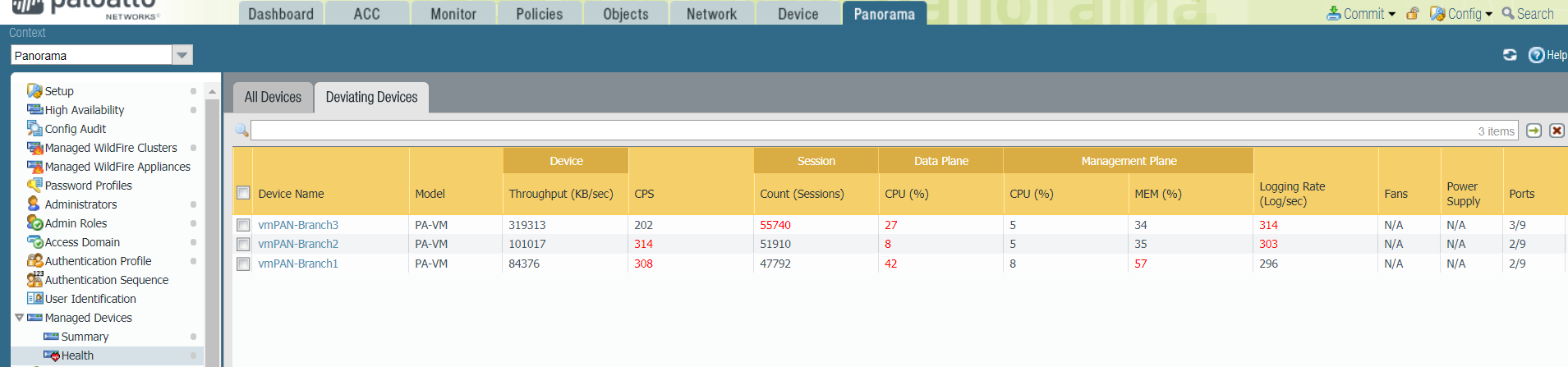 baseline.Panorama lists all firewalls that are reporting metrics that deviate from the calculated baseline and displays deviating metrics in red.