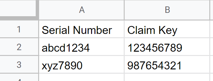 numbers and claim keys. The first column must contain the serial