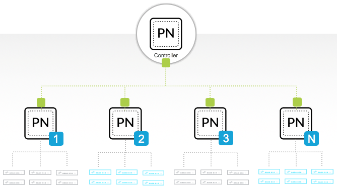 manages multiple Panorama Nodes, which in turn manage multiple devices.