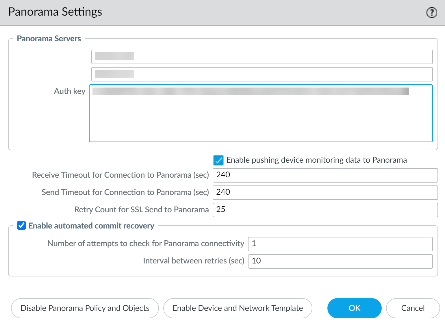 Configure the firewall to communicate with the Panorama Node.- Log in to the firewall web interface.Select DeviceSetupManagement and edit the Panorama Settings.Enter the Panorama Node IP address in the first field(Optional) If the Panorama Node is in an HA configuration, enter the IP address of the secondary Panorama Node in the second field.Enter the device registration Auth Key you copied in the previous step.Click OK.Select Commit and Commit your changes.